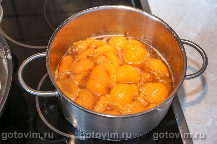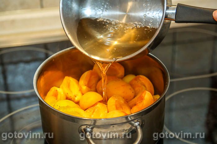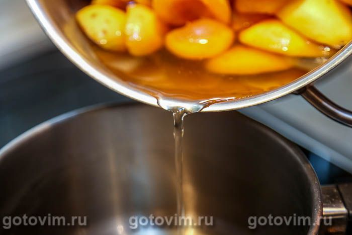 Поставить абрикосы в сиропе на слабый огонь, чтобы они томились, и из них выделялся сок. Когда сиропа в кастрюле с абрикосами станет значительно больше, чем было изначально, снять кастрюлю с абрикосами с огня и слить сироп в отдельную емкость.