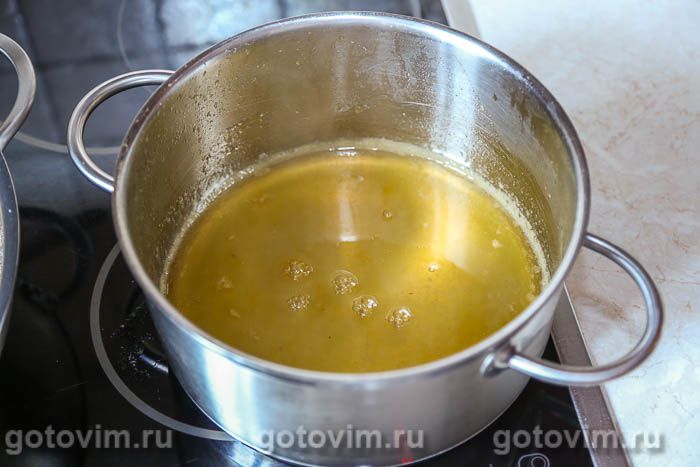 Сварить сахарный сироп: залить сахар водой и оставить на среднем огне, пока сироп не станет золотисто-прозрачным. Снять кастрюлю с сиропом с плиты и дать немного остыть.
