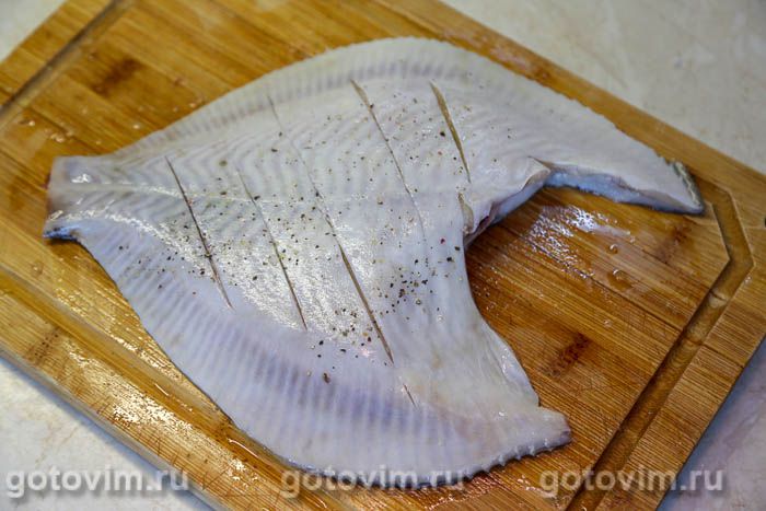Отрезать голову. Промокнуть рыбину снаружи и внутри бумажным полотенцем. Обязательно удалить черную пленку и кровь вдоль позвоночника камбалы.