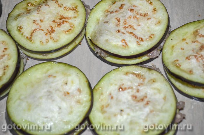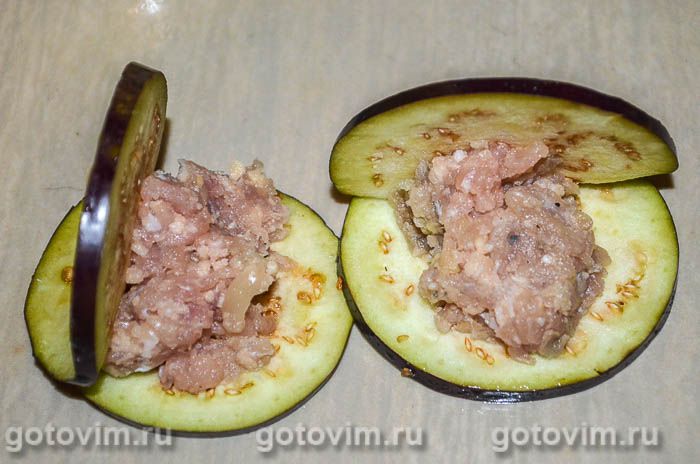 После этого отделяйте по два кружочка и отрезайте их от баклажанной гармошки. Когда все пары кружочков будут отделены, можно приступать к распределению фарша. В середину между кружочками вкладывайте по полной чайной ложке фарша. Фарш должен быть полностью готовым, соленым и перченным. Лучше всего брать свиной, он мягче и нежнее, но можно брать для баклажанов в кляре и смешанный фарш, и говяжий.