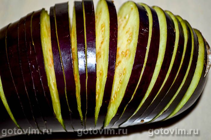 Вымойте и оботрите насухо баклажаны. Придерживая за плодоножку, разрежьте его на очень тонкие кружочки, толщина каждого около 3 мм, можно и тоньше. Нарезая кружочками, не доводите нож до конца. Из баклажана должна получиться гармошка как на фото.