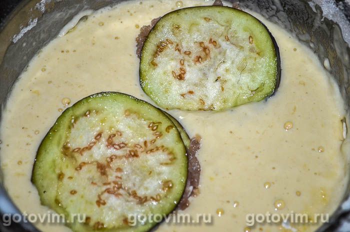 Для кляра взбейте яйцо с солью, водой и мукой. По желанию в кляр можно добавить щепотку черного перца. Опустите кружочки баклажанов в кляр, а затем в горячее масло.