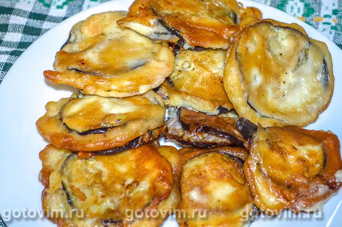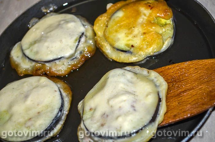 Обжаривайте баклажаны в кляре сначала с одной стороны. Затем аккуратно, лопаткой переверните на другую сторону. Времени на обжаривание уходит примерно столько же, сколько и на обжаривание оладий — около 3-4 минут на одну сторону.