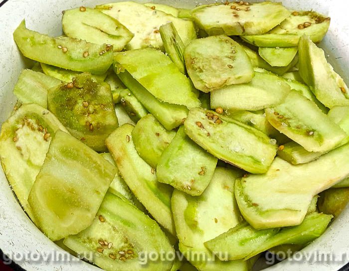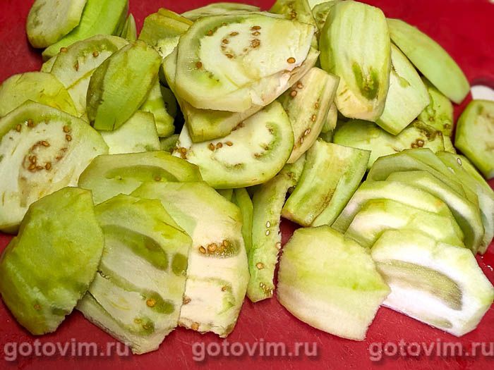 С баклажанов срезать кожуру, нарезать пластинами толщиной 5-7 мм.