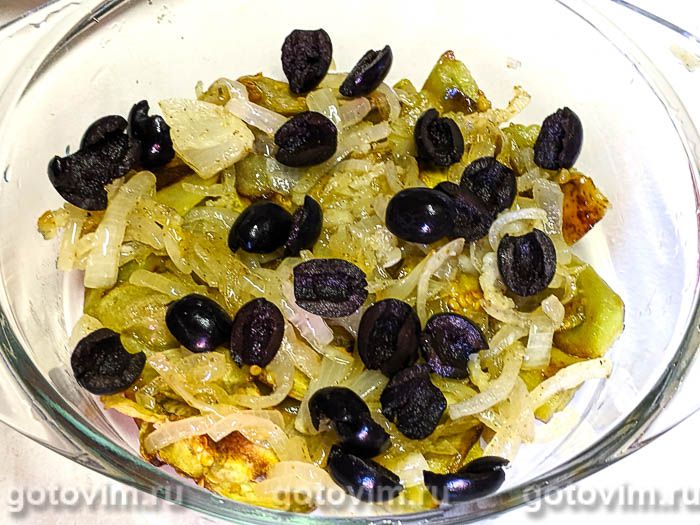 В жаропрочную форму выложить слой баклажанов, затем лук и оливки. Повторить слои еще раз и третий (последний) слой сделать баклажанов.