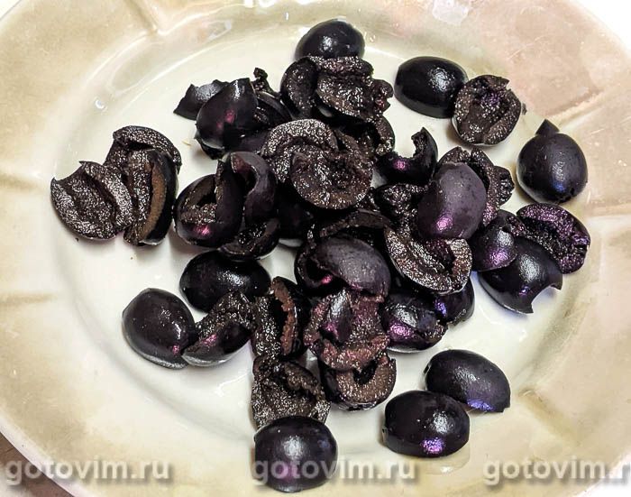 С оливок слить жидкость и разрезать каждую оливку пополам.