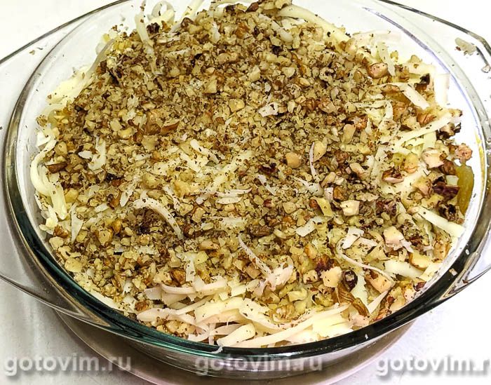 Грецкие орехи слегка обжарить на сухой (без масла) сковороде, дать им остыть и порубить ножом довольно мелко.