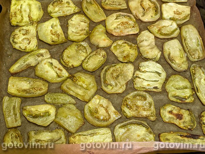 Затем баклажаны отжать, полить оливковым маслом, перемешать и разложить в один слой на противень, застеленный пекарской бумагой. Запекать в заранее разогретой до 200С духовке 20 минут.
