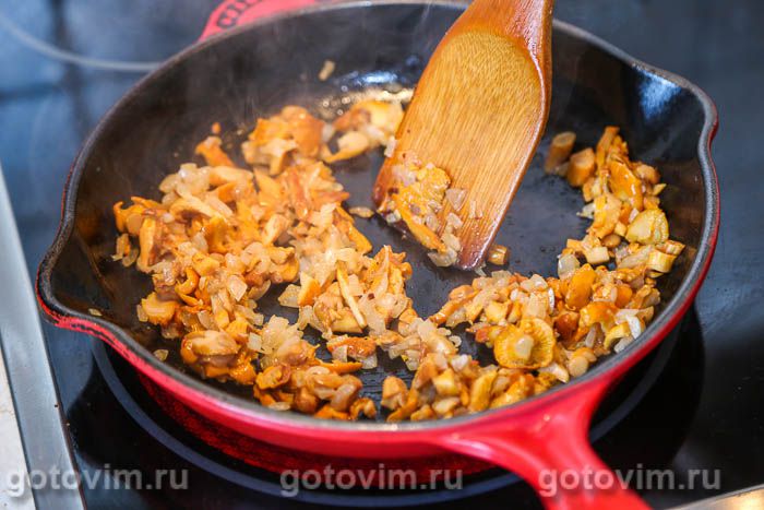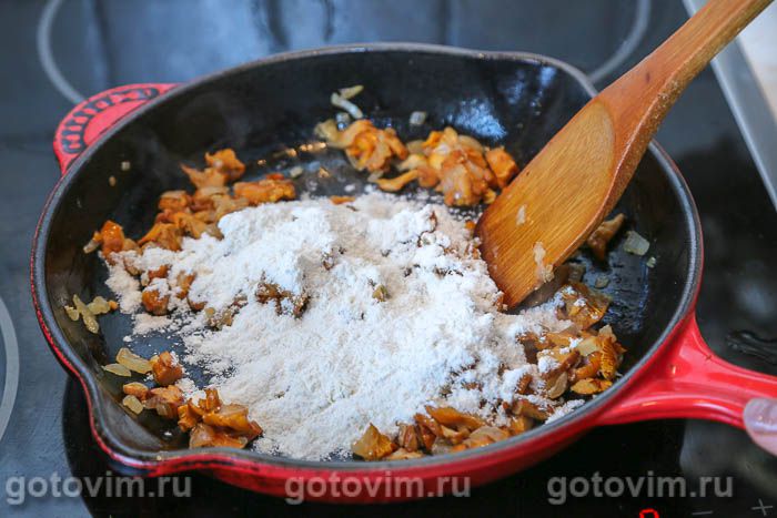 В сковороду с жареными грибами и луком просеять через сито муку, быстро перемешать и жарить еще 1 минуту.