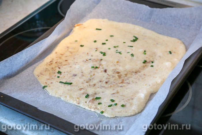 Сверху посыпать мелко рубленым зеленым луком. Запекать в предварительно нагретой до 180С духовке около 20 минут. Грибной бисквит за это время поднимется и станет упругим на ощупь.