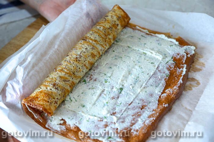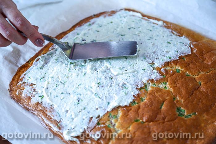 Пока печется бисквит, приготовить начинку, смешав сливочный (творожный) сыр с рубленой зеленью. Готовый пласт бисквита с лисичками переложить на рабочую поверхность, дать остыть минут 10. Затем смазать начинкой