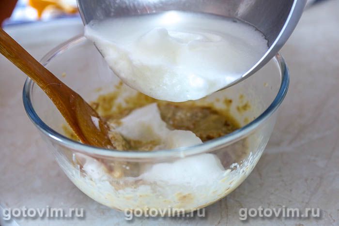 В отдельной миске взбить 3 белка в мягкую пену. Примешать взбитые белки к тесту. Делать это надо аккуратно, чтобы белки не осели. Если они осядут, то у вас вместо грибного бисквита получится грибной омлет.