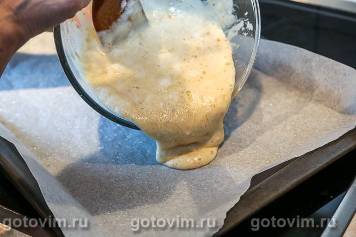 Застелить противень пекарской бумагой, смазать растительным маслом и распределить по нему грибное тесто толщиной 5-7 мм.