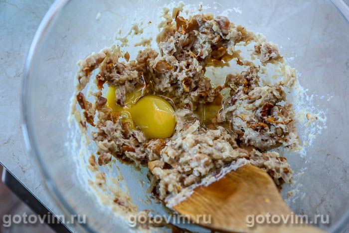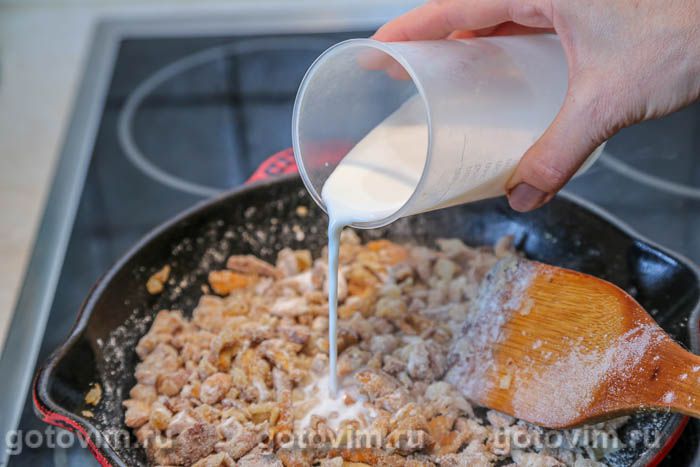 Не снимая сковороду с плиты, помешивая, тонкой струйкой влить к грибам молоко. Тщательно размешать, чтобы не образовалось комочков теста. Переложить получившуюся массу в миску и дать ей немного остыть.