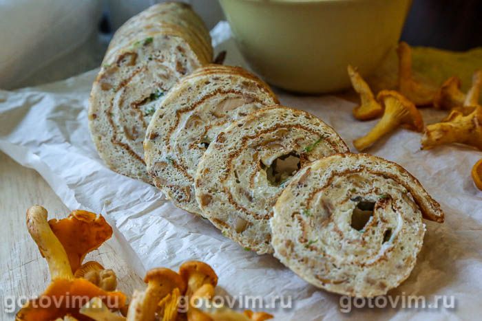 и скрутить рулетом. Обернуть рулет пекарской бумагой, на которой пеклось тесто, оставить на несколько минут, чтобы рулет не раскручивался. Готовый бисквитный рулет с лисичками порезать на ломтики и подавать к столу горячим или холодным.