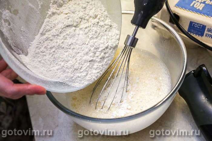 Продолжая работать миксером, частями добавлять просеянную муку.