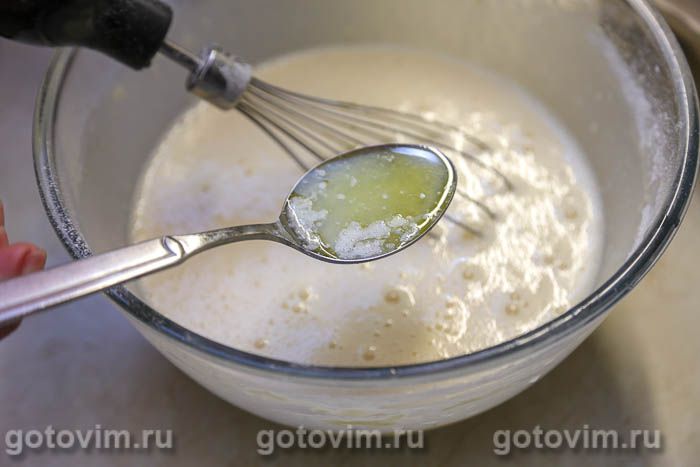 Добавить 2 ст.л. растопленного сливочного масла и взбивать еще примерно 20 секунд. Тесто получается довольно жидким, не пугайтесь.