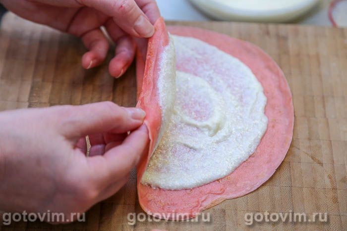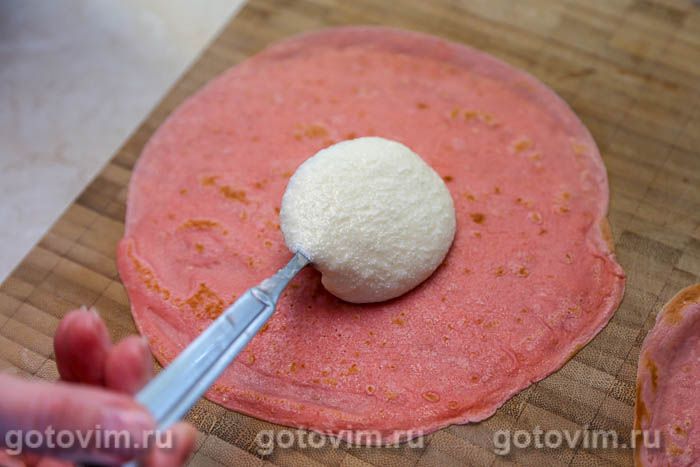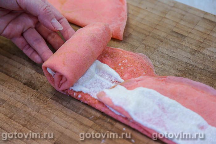 Сложить блин пополам кремом внутрь. Для формовки небольшого тортика будет достаточно 10 розовых блинов с начинкой.