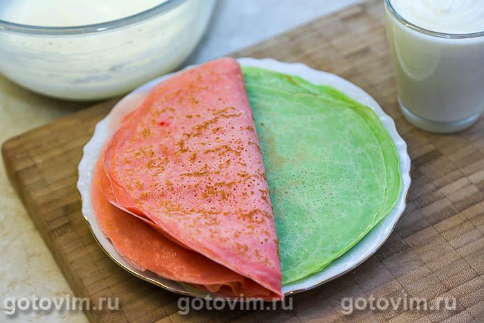 Замесить тесто для блинов на молоке. Подробный рецепт можно посмотреть полностью здесь. Тесто разделить на 2 неравные части. В большую часть добавить каплю красного пищевого красителя, в меньшую — каплю зеленого красителя.