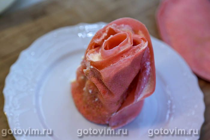 Снять с торта фольгу, немного отогнуть кончики блинов от центра, чтобы придать торту форму раскрывающегося розового бутона. Блинный торт «Роза» готов к подаче. Его легко разрезать ножом на порции, что демонстрирую на видео. Приятного аппетита!