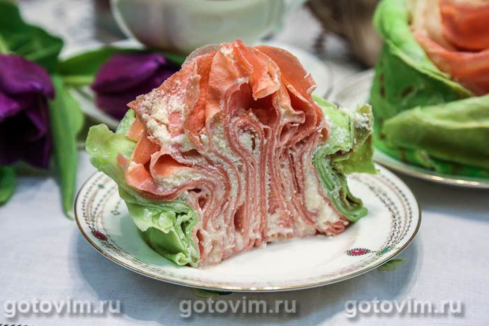 и приложить к центральной розовой части блинного торта. Так же поступить с остальными зелеными блинами.
