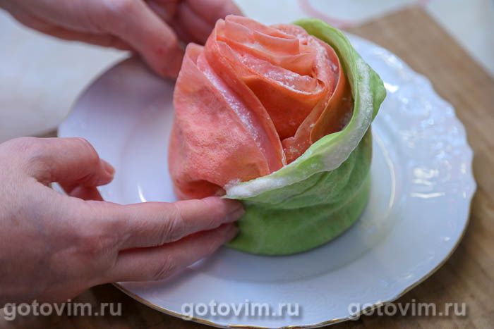 Блинному торту можно придать любую форму. Мы уже показывали, как скрутить его улиткой, собрать в виде купола или украсить рулетиками из блинов. Сегодня приготовим торт из блинов с заварным кремом в виде бутона розы. Для большей правдоподобности добавим в блинное тесто немного пищевого красителя, чтобы лепестки были розовые, а чашелистики — зеленые.