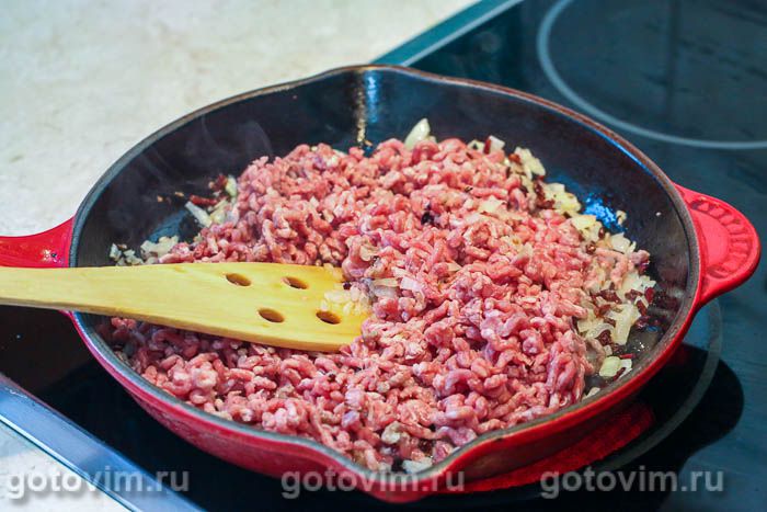 В глубокой сковороде пассеровать на растительном масле мелко нарезанный лук с чесноком. Добавить мясной фарш, размешать, чтобы не образовалось комочков, и обжарить до готовности. Приправить по вкусу солью и молотым черным перцем.