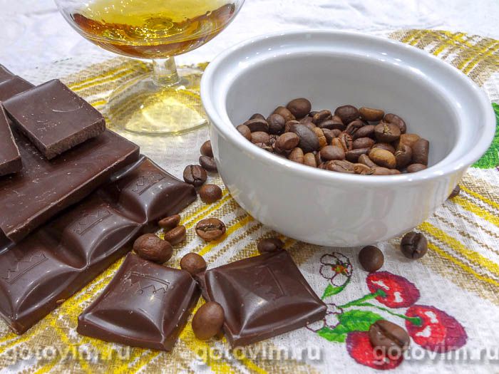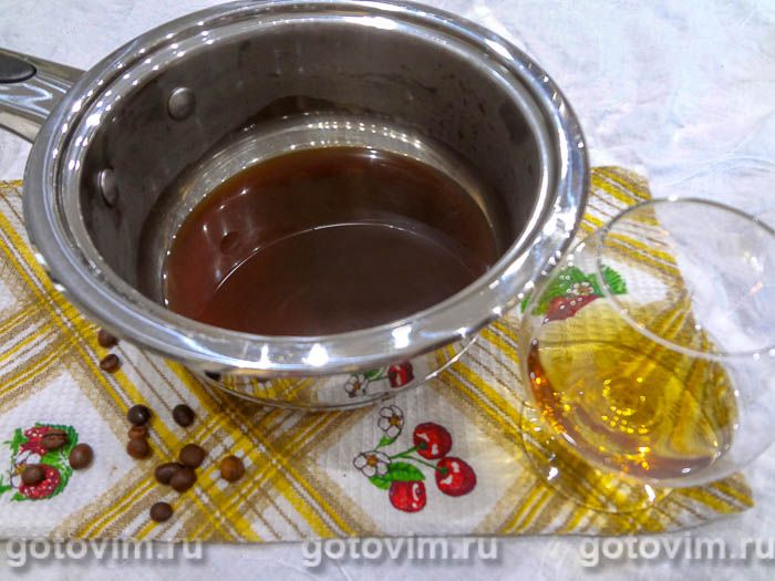 Заварите натуральный кофе или приготовьте обычный растворимый. Полученный кофейный напиток процедите от крупинок и доведите до 180-ти мл, добавив воды. Влейте в кофе коньяк или можно использовать любой другой ароматный спиртной напиток, например, кофейный или апельсиновый ликер. Если вам нельзя употреблять кофе — попробуйте заменить его обычным молоком, вкус получится еще нежнее.