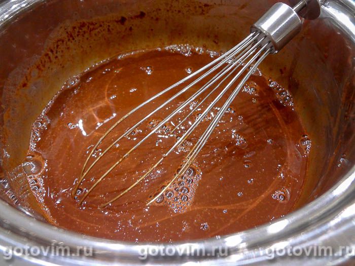 Ставим пиалу с растопленным в кофе шоколадом в миску большего диаметра, на дно которой необходимо налить ледяную воду или всыпать кубики льда. Дно посуды с шоколадом должно касаться ледяной воды или льда. Начинаем интенсивно взбивать шоколадную массу. Первые 3-5 минут шоколадная масса не будет видоизменяться, но примерно с 6-7 минуты она начнет густеть под воздействием холода. Поэтому если вы используете ледяную воду — меняйте ее почаще.