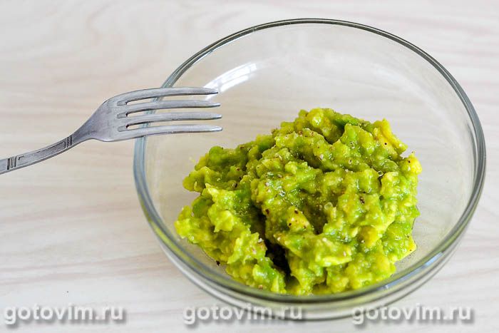 Авокадо освободить от кожицы, размять мякоть вилкой, сбрызнуть лимонным соком, чтобы масса не потемнела. Посолить и поперчить.