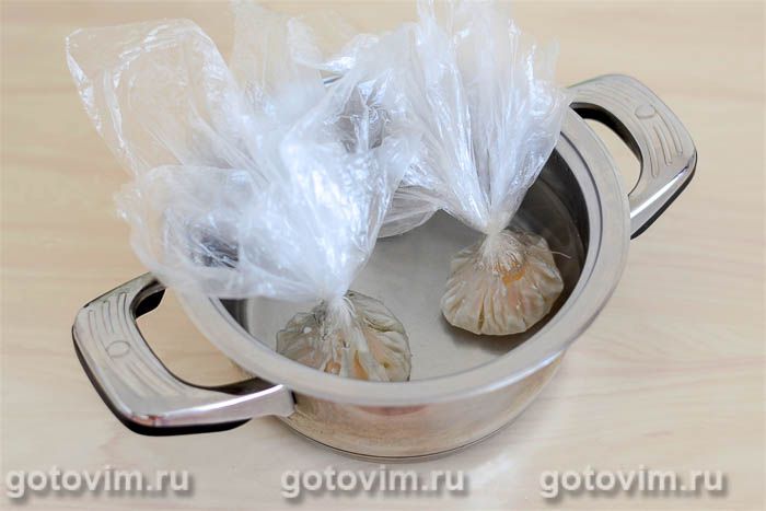 Поместить мешочки с яйцами в кастрюлю с кипящей водой и отваривать в течение 2-3 минут на умеренном огне. Дольше держать не стоит, иначе желток станет плотным, а в яйце пашот он должен оставаться жидким. Когда белок схватится и побелеет, выключайте плиту и дать яйцам дойти до готовности еще 1 минуту.