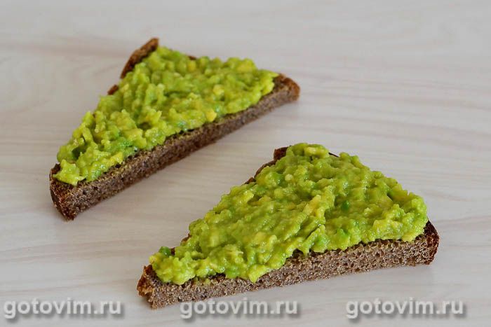 На ломтики черного хлеба выложить равномерным слоем пасту из авокадо.
