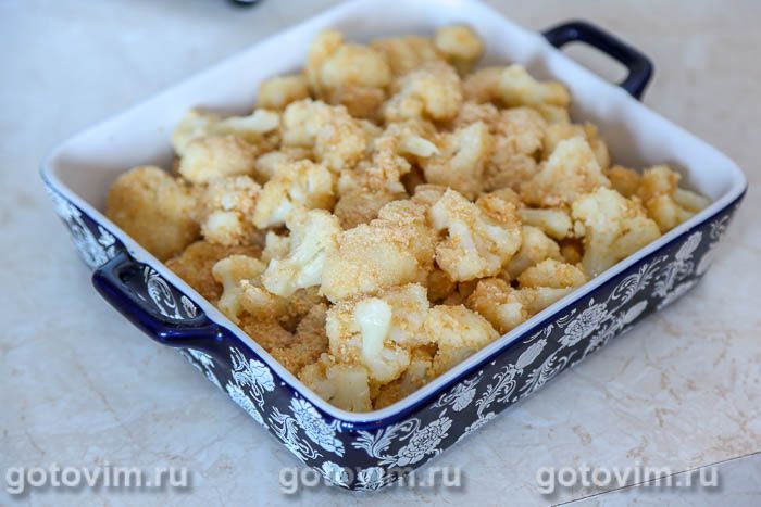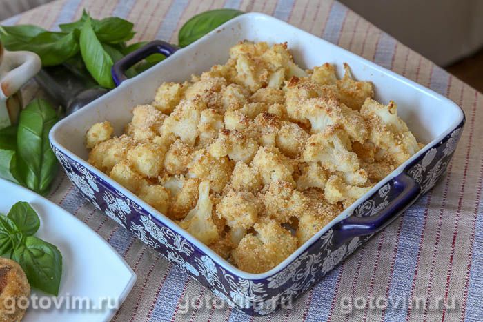 Запекать в предварительно прогретой до 180С духовке около 10 минут, пока на капусте появится золотистая корочка. Готовую цветную капусту в сухарях подать с соусом как самостоятельное блюдо или как гарнир к рыбе и мясу.