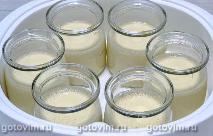 Переливаем топлёное молоко с йогуртом в кастрюлю с остальным молоком и снова всё хорошенько перемешиваем. Это необходимо проделать для того, чтобы йогурт равномерно распределился по всей молочной массе, а на выходе получилась однородная структура готовой ряженки. Разливаем получившуюся смесь по небольшим стеклянным емкостям и убираем в тёплое место, укутываем одеялом или махровым полотенцем. Оставляем на 5-6 часов, пока ряженка не загустеет. Спустя указанное время можно проверить консистенцию ряженки.