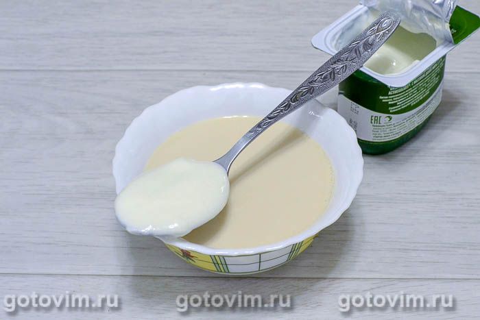 В небольшой ёмкости смешиваем примерно 1 стакан теплого топлёного молока с двумя столовыми ложками натурального йогурта без добавок. Хорошенько перемешиваем ложкой до однородности, разбивая все комочки.