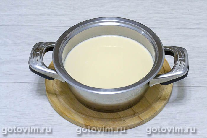 Топлёное молоко переливаем в кастрюлю и ставим на плиту. Доводим до кипения и сразу снимаем кастрюлю с огня. Даем молоку остыть примерно до 40С.