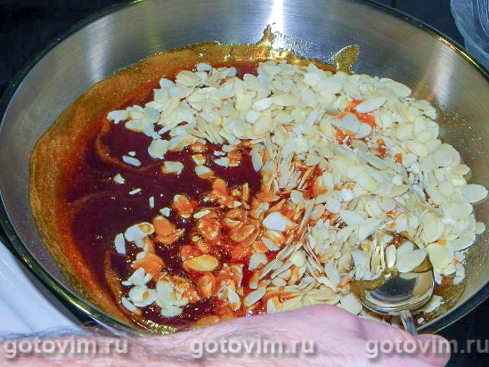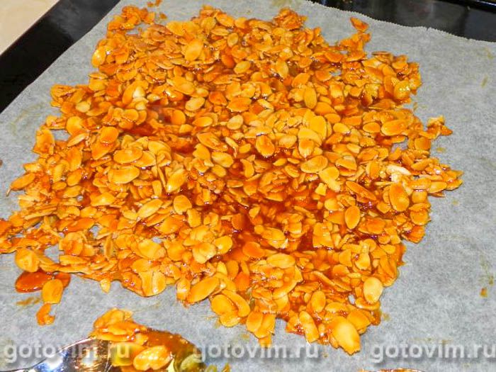 Разогреваем сахар в сковороде. Не трогаем, пока сахар не начнёт менять цвет. Перемешиваем и варим до янтарного цвета. Затем снимаем с огня и вмешиваем миндаль.