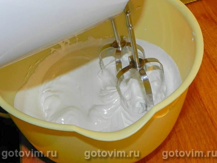 Взбиваем белки с 1/3 объёма сахара до плотной пены, затем добавляем оставшийся сахар и взбиваем до блеска. Белки должны быть взбиты очень плотно. В отдельной посуде взбиваем сливки в плотную пену.
