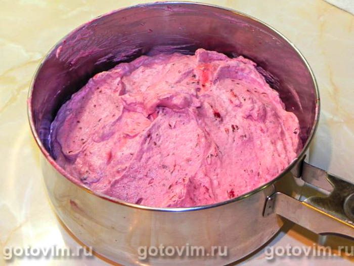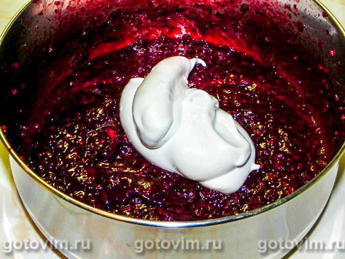 Начинаем собирать мусс. В охлаждённое ягодное пюре добавляем 1/3 взбитых белков и размешиваем до однородной массы.