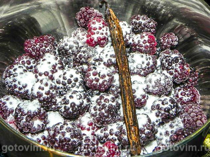 Делим ванильную палочку по длине и выскабливаем ножом семена. Укладываем ежевику, ваниль (семена + палочка) и 2 ст.л. сахара в кастрюлю и подогреваем на небольшом огне. В процессе подогрева, слегка прижимаем ягоды ко дну венчиком. Дадим слабо покипеть около 5 минут. Снимем кастрюлю с огня и удалим ванильную палочку.