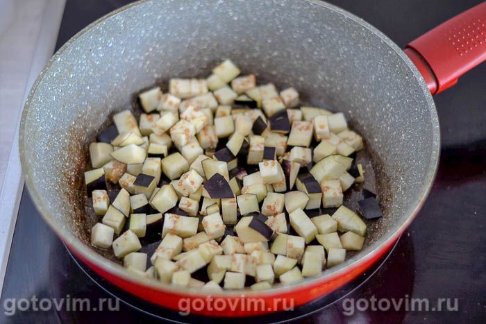 Разогреваем глубокую сковороду, добавляем масло и кладем нарезанные баклажаны.