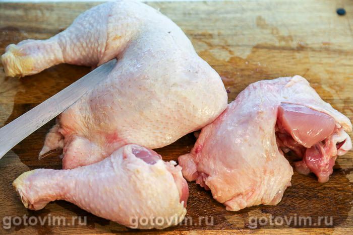 Курицу вымыть, обсушить на бумажных полотенцах. Если берете куриные голени, то разрежьте их по суставу на 2 части. Мясо посыпать солью (хватить 1/4 ч.л.) и молотым черным перцем. Можно взять готовую смесь пряностей и натереть курицу ею.