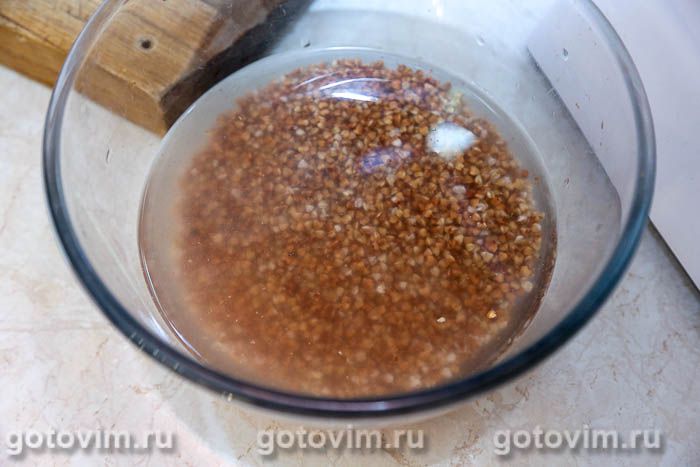 Гречку промыть, залить кипятком и отставить в сторону, пока подготавливаете остальные продукты.