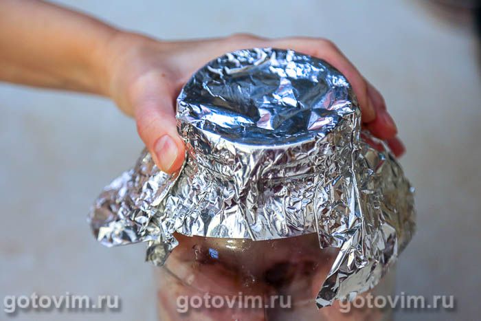 Горлышко банке закрыть сложенной в 2 слоя фольгой. Банку протереть салфеткой, чтобы перед постановкой в духовку она была сухая.