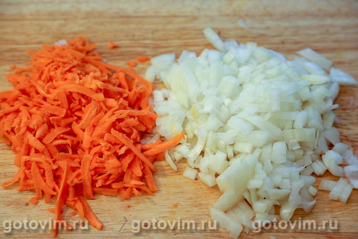 Приготовить овощи для пассеровки. Лук и морковь очистить. Очищенную луковицу мелко порубить. Морковь натереть на крупной терке или нарезать соломкой.