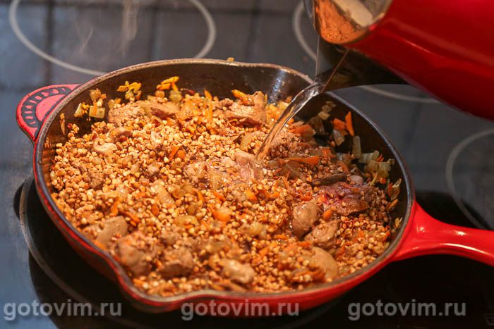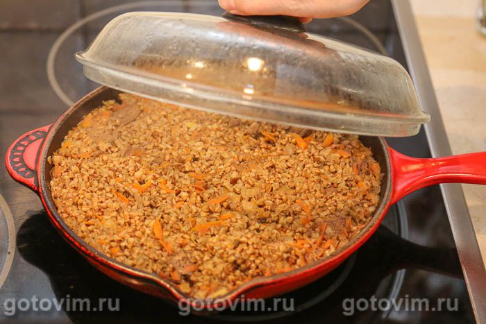 Залить горячей водой из чайника или горячим бульоном. Жидкость должна полностью покрывать содержимое сковороды. Еще немного присолить, затем прикрыть сковороду крышкой, но не плотно, и варить на слабом огне около 15-17 минут. За это время вся жидкость впитается в гречку.