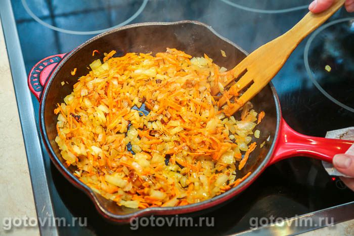 В глубокой сковороде (или кастрюле с толстым дном) разогреть 1-2 ст.л. растительного масла. Добавить измельченные овощи, уменьшить нагрев до среднего и пассеровать до мягкости моркови и прозрачности лука.