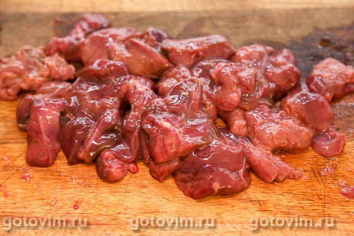 Куриную печень промыть, каждую разрезать на 2-3 части.
