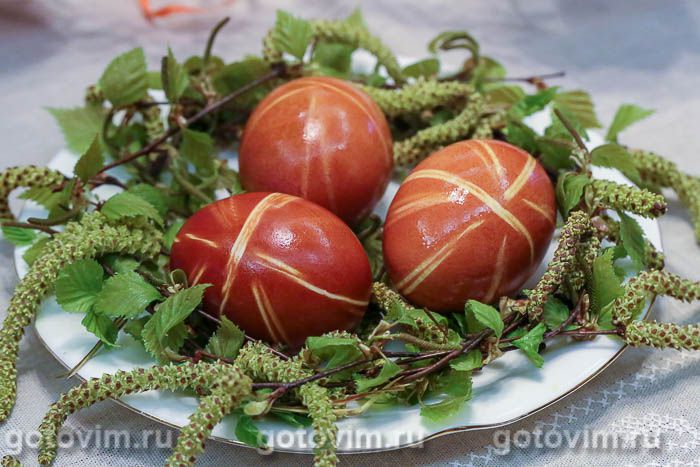 Яйца в луковой шелухе с рисунком (с резинками). Рецепт с фото