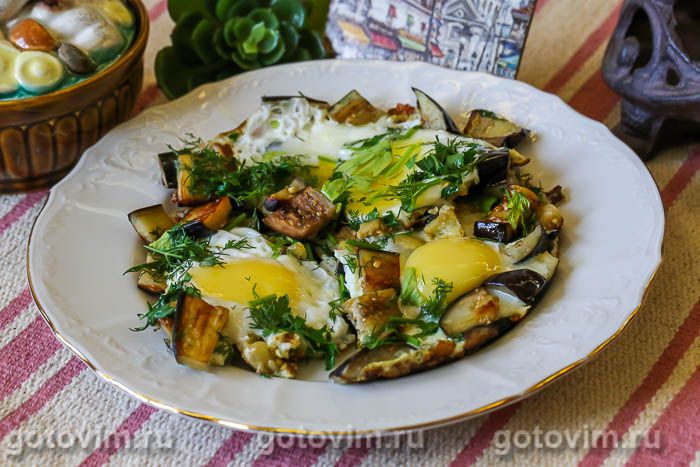 Сезонные овощи, такие как баклажаны, подойдут не только для обеда, но и для завтрака. Как вы смотрите на яичницу глазунью с жареными баклажанами? Никаких сложностей в приготовлении нет. Надо только подготовить баклажаны так, как описано в рецепте, чтобы они успели прожариться, подрумяниться и впитали минимум масла.